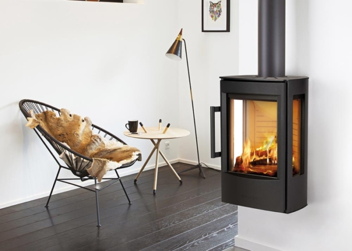 Through WIKING Miro’s broad side glass and the large glass pane in the sturdy cast iron door, there is ample opportunity to watch the flames in the open and bright combustion chamber. Slightly slanted angles at the back enhance the looks of WIKING Miro – not only on an even wall, but also in a corner.