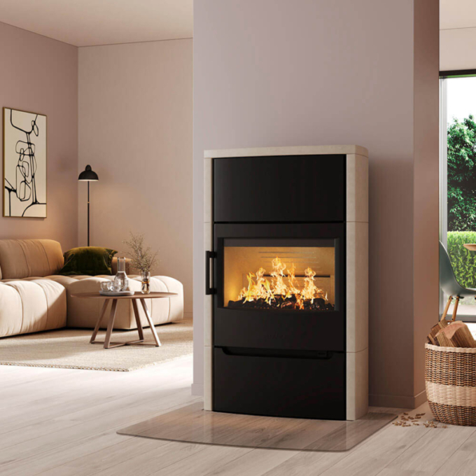 Wiking Maxi comes in three heights—Maxi 2, Maxi 4, and Maxi 6—with options for wall mounting, low or high legs, and natural stone cladding in white (only for Maxi 6) or grey. The stove features white stone cladding (also available in natural grey stone), perfect for retaining heat long after the fire goes out. With this model, heat storage stones are available as an added extra; these fit in the top compartment and will add even more retaining heat to the stove. This stove is available in black or grey steel.